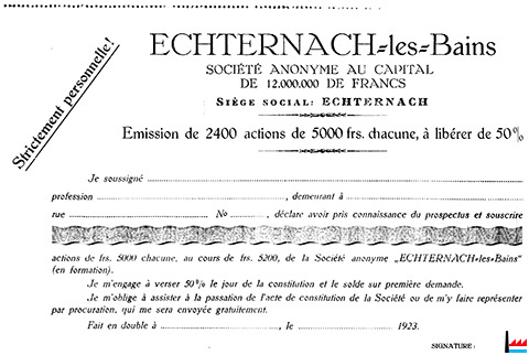 | 1923 | ![]() Capital social: 12.000.000 LUF représenté par 2.400 actions de 5.000 LUF chacune |