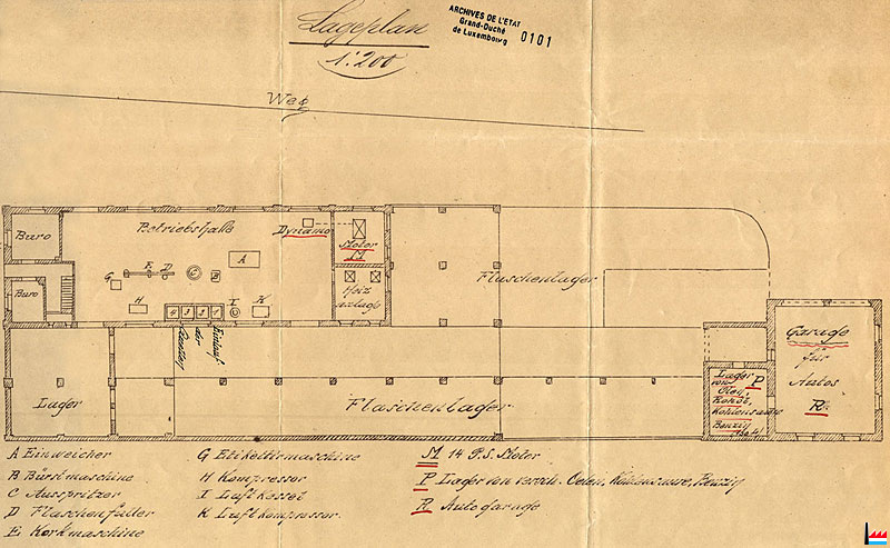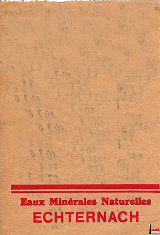 | 29.11.1924 | Société des Eaux Minérales d'Echternach S.A. Fondation par / Gründung durch: Jean Simon - Bailleux Capital: 1.600.000 LUF représenté par 3200 actions de 500 LUF chacune an der Straße Echternach - Rodenhof, im Ort genannt "Lütschen" |