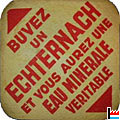 Sous-bock Echternach Eau minérale gazéifiée Eaux médicinales naturelles L'eau de régime par excellence Autorisée par l'Etat Fournisseur de la Cour Grand Ducale Dépositaire: Rob. Otten 734 Ch. de Gand Bruxelles |