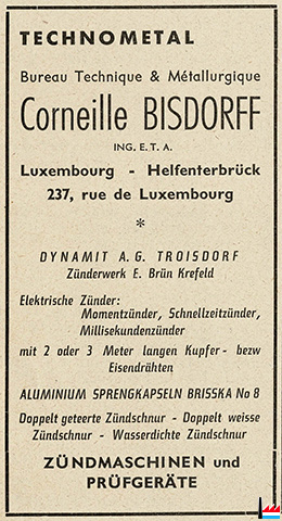 | 1935 | Explosifs Luxite s.àr.l. - La Poudrerie de Luxembourg S.A. et la Dynamit A.G. (anciennement Alfred Nobel et Cie) établie à Troisdorf, ont constitué une Société à responsabilité limitée au capital de 500.000 fr. représenté par deux parts sociales ayant chacune une valeur de 250.000 fr., la Explosifs Luxite qui est la transformation de l’ancienne S. A. Luxembourgeoise pour la Fabrication d’Explosifs de Sûreté; tout l'actif et tout le passif de cette société continuent à appartenir à la Société à responsabilité limitée Explosifs Luxite. (Luxembourg 15.11.1935) |