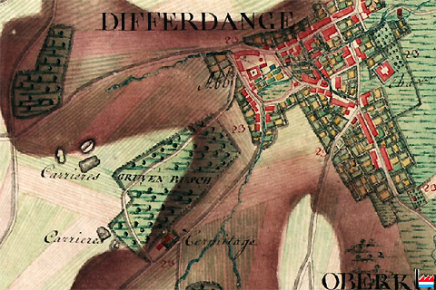 Carrières Gruvenbusch près de Differdange - 1777 (Carte de Ferraris - Bibliothèque royale de Belgique - 2010)