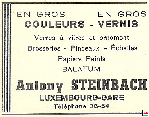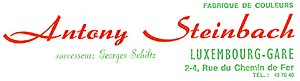 | Antony Steinbach fils, Luxembourg rue de Bonnevoie, 9 Epicerie et représentations commerciales. Exploitant : Antony Jean-Aurélien Steinbach, Luxembourg. (Registre aux firmes N° 1096 - Du 27 septembre 1910) Antony Steinbach père, Luxembourg avenue de la Faïencerie Epicerie et représentations commerciales. Exploitant : Antony Steinbach père, Luxembourg. (Registre aux firmes N° 1097 - Du 27 septembre 1910) |