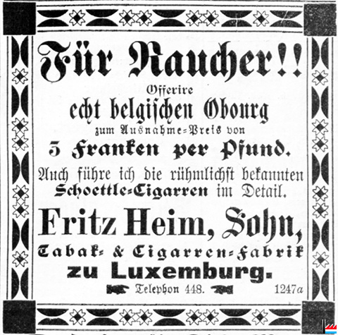 | 1894 | ![]() T abak- & Cigarren-Fabrik Fritz Heim, Sohn, zu Luxemburg, tél: 448 (OMZ: 2.11.1894) Obourg, Schoettle-Cigarren |