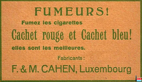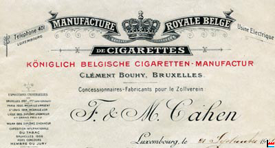 | <=1935 | Königlich-Belgische Zigarettenmanufaktur, succ. de Luxembourg, F. & M. Cahen 4 rue Wallis, Luxembourg |
