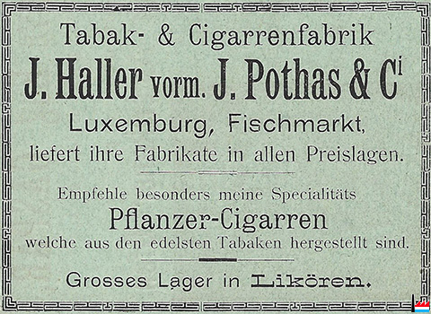 | <=1907 | Pothas - Haller Wwe, Tabakhandlung, Fischmarkt 8 J. Haller vormals. J. Pothas & Cie, Fischmarkt, Luxemburg |