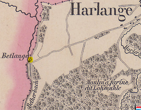 Betlange, Betherbach - Moulin à farine, dit Lohmühle, Harlerbach, Harlange (Carte Jean-Baptiste Liesch - 1862)