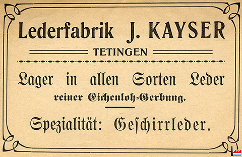| <=1913 | ![]() Lederfabrik J. Kayser, Tetingen (Source: Volksbildungskalender 1913; scan: Romain Gaspar) Lager in allen Leder-Sorten - reine Eichenloh-Gerbung Spezialität: Geschirrleder |