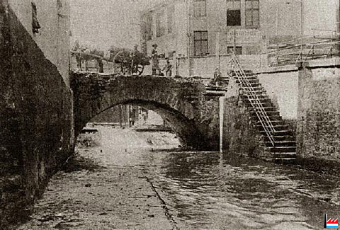 Die alte Brücke am Eingang von Stadtgrund, in der Nähe der Färberei Schmit, wird abgetragen (1925)