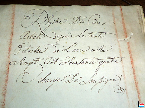 Registre des cuirs achetés depuis le 30 octobre de l'an 1764 à charge du soussigné (Collection: