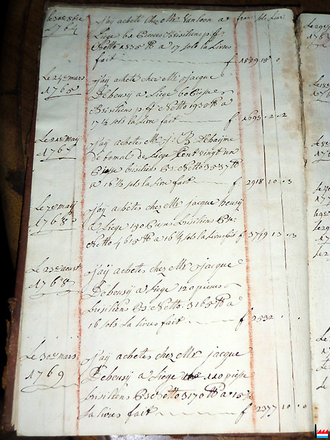 Le contenu du registre est intéressant: il mentionne des fournisseurs de peaux, des achats, crédits et remboursements. Certains noms se retrouvent souvent, comme "le baron de Haÿme", "Marchant d'Ansembourg"…