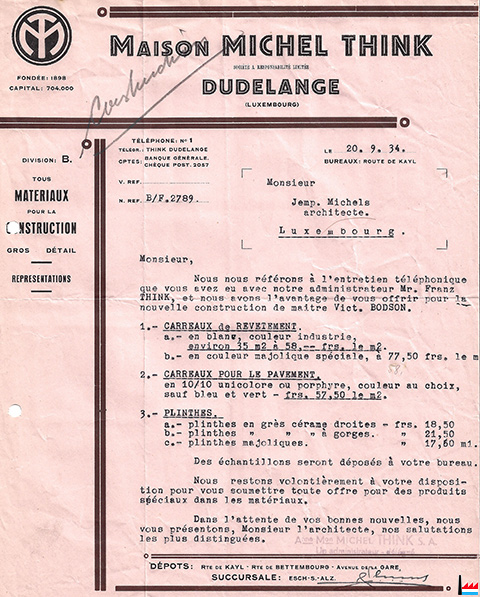 « Ancienne Maison Michel Think », Société anonyme, Dudelange. Art. 1ᵉʳ. (…). Art. 6. (…). 1° à Mme Michel Think, cinq cent vingt-trois actions (…). Capital : 704.000 francs (Mémorial : 27.4.1932) |