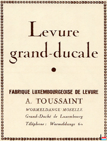 | 1936 | Marque de fabrique N° 7841 - 19 février 1936 Fabrique luxembourgeoise de Levure A. Toussaint à Wormeldange-sur-Moselle Produit : Levure de la maison déposante |