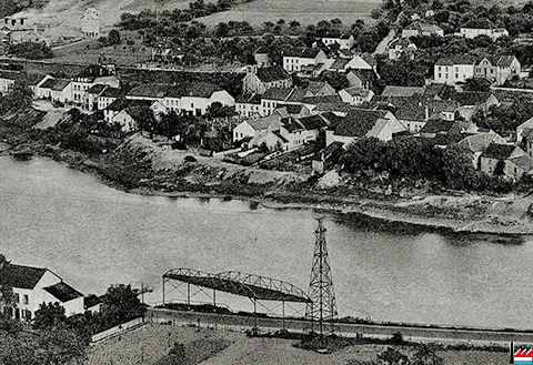 | 9.1909 | Grevenmacher, 28. Sept. Gestern morgen gegen 10 Uhr fuhr ein kleiner Benzin-Salon-Schraubendampfer hier vorbei. Darin befanden sich der preußische Strombaumeister aus Trier, Baukondukteur Namür von hier und der Direktor der Firma Itschert aus Wellen. Sie fuhren bis ans Haus Kelsen um die Bauarbeiten der Holzgerüste zu besichtigen, welche hier errichtet sind, zur Hebung der Seile der Drahtseilbahn, welche über die Mosel schweben und der Schifffahrt hinderlich sind. Die Arbeiten müssen über 8 Tage fertiggestellt sein. Auch sind die Arbeiten zur Überbrückung des Leinpfades oberhalb des Hauses Kelsen wieder in Angriff genommen. (LW: 29.9.1909) |