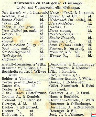 (Source: Almanach du Commerce du Grand-Duché de Luxembourg par N.C., 1re année, 1857, Luxembourg, Heintzé Frères, Libraires-Éditeurs; page 23; Collection: famille Aschman-Bodson)