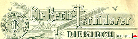 | 1910 | Charles Bech - Tschiderer (* 1840 Grevenmacher, + 1924 Diekirch, fils de Charles Bech - Foehr), Diekirch Opérations de banque, distillerie, denrées coloniales, produits agricoles Exploitant : Charles Bech, Diekirch (Inscription au registre aux firmes N° 130 - Du 15 juin 1910) |