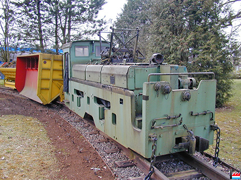 Monument: Locomotive électrique de mine MMR No 34? / ex No ? Mine de Nondkeil (Jeumont; 1958) avec wagons type "F" au parc du Casino des ingénieurs à Rodange, 40 rte de Longwy (Photos: 3.4.2003 jmo)
