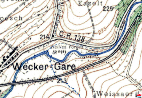 ![]() Vieilles Forges - 1954 © Origine Administration du Cadastre et de la Topographie Luxembourg (ACT) - Extrait de la carte topographique à l'échelle 1: 25.000 édition 1954 - Autorisation de publication du 20.10.2010.» |