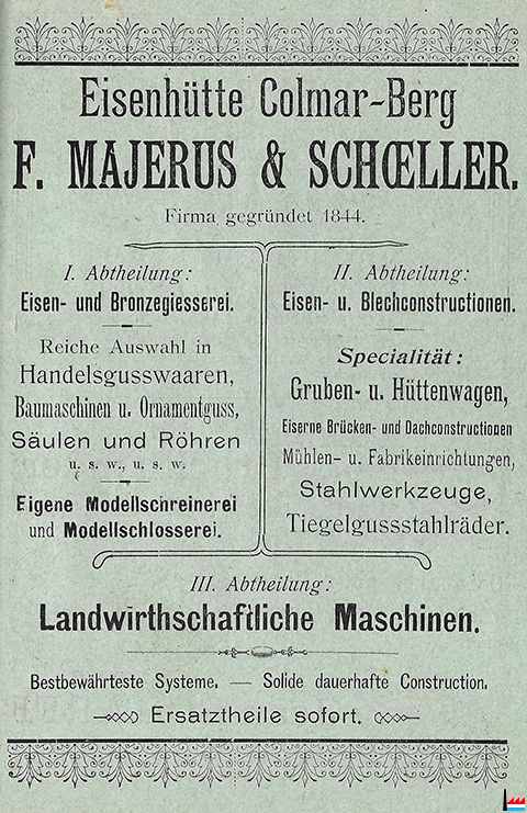 | <=1877 | A. SCHOELLER & Cie Colmar-Berg landwirtschaftliche Maschinenfabrik Constructionswerkstatt u. Eisengießerei |