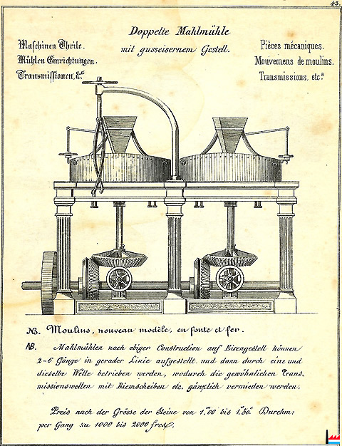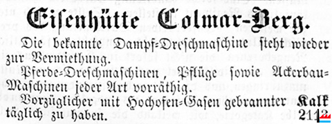 | 6.9.1857 | Usines royales de Berg-Colmar Le moulin à farine et à concasser, système Clayton, portatif, avec meules françaises est à vendre ou à louer. Un moteur de 3-4 chevaux suffit. Produit 150-200 litres par heures. Ce moulin a remporté plusieurs médailles, voir le catalogue des Usines, planche 38. Toutes les demandes regardant l'atelier de construction, les fers, poterie, chaux, tuiles, briques, tuyaux se drainage doivent être adressées dorénavant à la Direction, à Berg, ou bien au commis-chef à l'Usine |