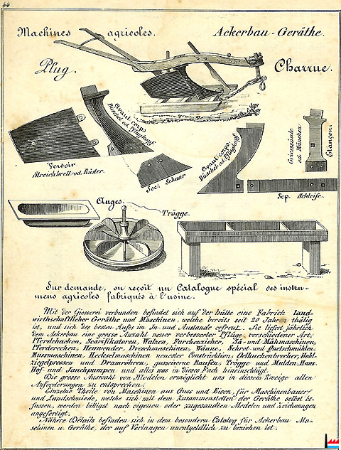 Mit der Giesserei verbunden befindet sich auf der Hütte eine Fabrick landwirtschaftlicher Geräthe und Maschinen, welche bereits seit 20 Jahren thätig ist, und sich des besten Rufes im In- und Auslande erfreut. Sie liefert jährlich dem Ackerbau eine grosse Anzahl neuer verbesserter Pflüge verschiedener Art, Pferdehacken, Scarifikatoren, Walzen, Furchenzieher, Sä- und Mähmaschinen, Pferderechen, Heuwender, Dreschmaschinen, Wänne, Schrot- und Quetschmühlen, Mussmaschinen, Hechselmaschinen neuester Constrücktion, Oelkuchenbrecher, Hohlziegelpressen und Dramröhren, gusseiserne Raufen, Trögge und Mulden, Haus- Hof- und Jauchpumpen und alles was in dieses Fach hineinschlägt.