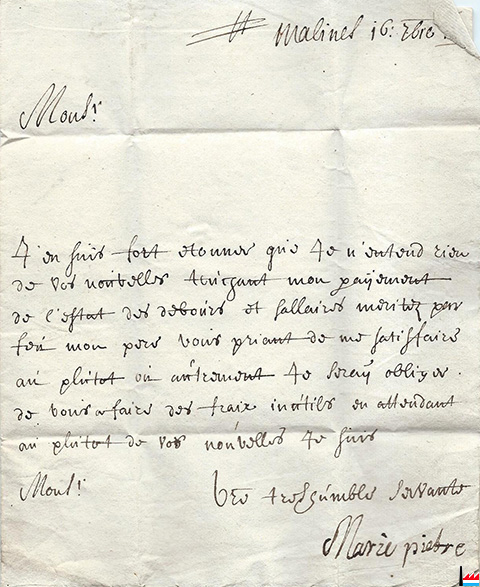 | 16.9.1716 | ![]() Mr Blochausen, maître de Forges à Berg - lettre de Malines (Collection: Jean Diederich) |