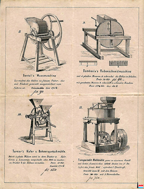 | Neueste und Vorzüglichste Futtermaschinen der Landwirtschaftlichen Maschinen und Geräthe - Fabrik von F. MAJERUS & SCHOELLER. Eisenhütte COLMAR-BERG Grossherzogthum Luxemburg. Gr. Gold Medaille. Paris 1855 Silb. Medaille. Trier 1854 Gold. Medaille. Luxemburg 1852 Gold. u. Silb. Medaillen. Dinant 1864 und Arlon 1851. 1866. Gold. Medaille. Metz 1861 Köln 1865 1. Bentall’s Häckselmaschine N° 1 2. Bentall’s Häckselmaschine N° 2 3. Bentall’s Häckselmaschine N° 3 4. Guillotin Häckselmaschine 5. Dean’s Häckselmaschine 6. Richmond und Chandler´s Häckselmaschine 7. Dombasle´s Häckselmaschine 8. Bentall´s Mussmaschine 9. Dombasle´s Rübenschneidmaschine 10. Turner´s Hafer und Bohnenquetschmühle 11. Transportable Mahlmühle Source: Catalogue illustré de 1866/1867 (?) (Collection Charles-Louis Aschman) |