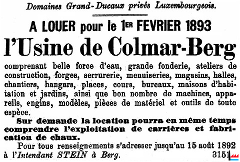 Domaines Grand-Ducaux privés Luxembourgeois: Usine de Colmar-Berg à louer pour le 1.1.1893 (LW)