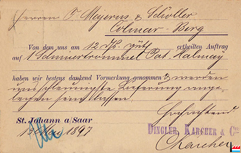 | 1897 | ![]() Dingler, Karcher & Cie, St. Johann a.d. Saar - F. Majerus & Scholler, Colmar-Berg - 13.5.1897 (Collection: industrie.lu) |