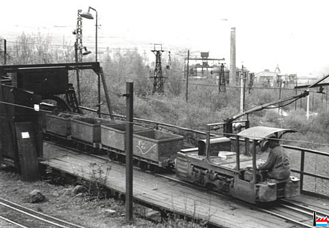 wagonnets au culbuteur; au fond le transporteur aérien