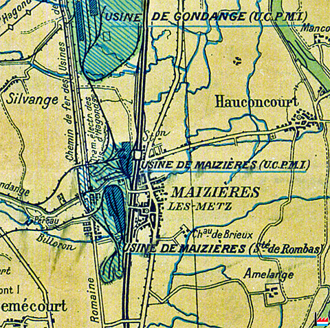 Ancien texte: A gauche, l'ancienne usine de Sambre et Moselle, à droite l'Usine de Maizières-les-Metz (Moselhütte) (Collection: industrie.lu)
