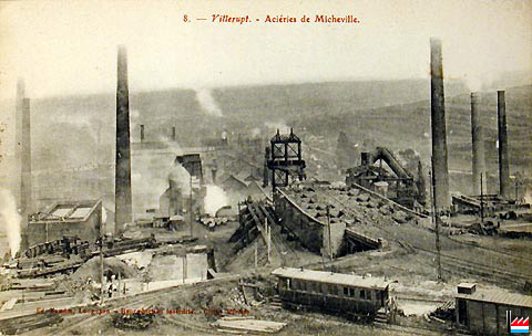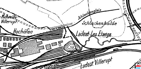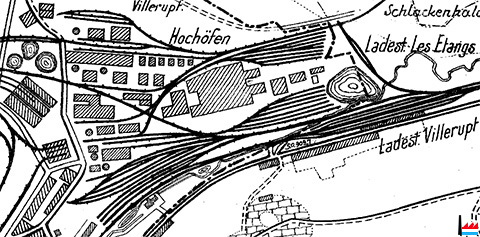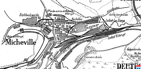 | 1910 | ![]() Usine de Villerupt - Micheville (Übersichtskarte des Erzgebietes bei Deutsch-Oth, Esch und Villerupt - Kaiserliche Eisenbahn-Generaldirektion, Strassburg - 2.1910) Schiefe Ebene mit elektrischem Wagenaufzug Stahlwalzwerke Hochöfen Schlackengleis Schlackenhalde |