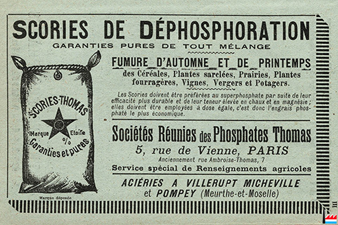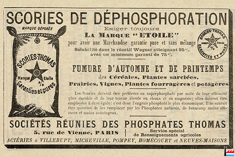| 1908 | ![]() Marque Etoile - Scories de déphosphoration - Aciéries à Villerupt, Micheville, Pompey, Homécourt et Neuves-Maisons - Sociétés Réunies des Phosphates Thomas, Paris, 5 rue de Vienne (Collection: industrie.lu) |
