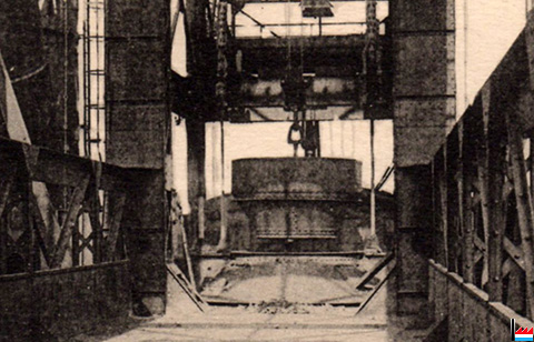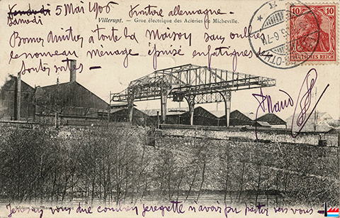 | <=1906 | ![]() Grue électrique des Aciéries de Micheville, Villerupt - vers 1906 (Carte postale: Edition Spielmann, Villerupt; collection: industrie.lu) |