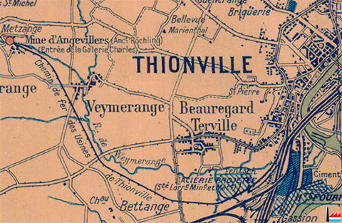 Entrée de la galerie Charles de la Mine d'Angevillers (Anct. Roechling) à Metzange - Chemin de fer aux Usines de Thionville (Détail de la Carte dressée et dessinée par G. Peltier - 21 rue de l'Union - Clamart - Paris; 1920)