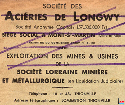 Exploitation des mines et usines de la Société Lorraine Minière et Métallurgique (en liquidation judiciaire) Adresse télégraphique: LOMIMETION-THIONVILLE |