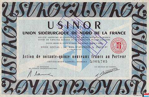 USINOR - Union Sidérurgique du Nord de la France - Action de 75 nouveaux francs (Collection: industrie.lu)
