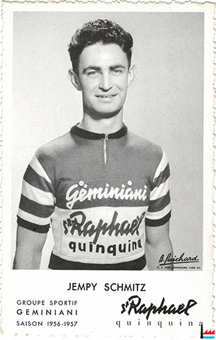 Jempy Schmitz (* 15.2.1932 Huldange; † 14.11.2017), coureur, Groupe sportif Géminiani - St. Raphael quinquina - Saison 1956-57 (Collection: industrie.lu)