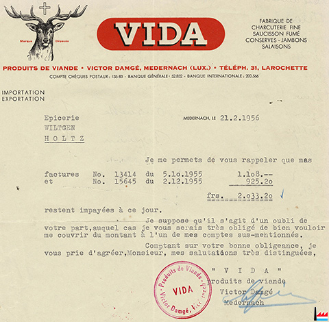 | 1956 | ![]() Facture VIDA, Medernach à Epicerie Wiltgen, Holtz - 21.2.1956 (Collection: industrie.lu) |