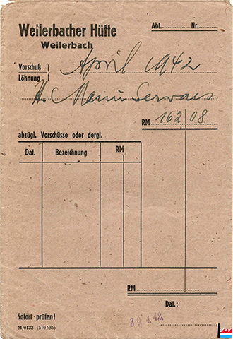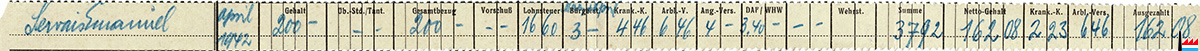 ![]() Paitut vun der Weilerbacher Hütte, Weilerbach - Lohntüte 4.1942 (Collection: Familienarchiv Servais) Manu Servais 162,08 RM Lohnabrechrechung der Weilerbacher Hütte, Weilerbach - 4.1942 (Collection: Familienarchiv Servais) Emanuel Servais - Nettogehalt: 162,08 RM Gehalt: 200 RM Lohnsteuer: 16,60 RM Bürgersteuer: 3 RM Krankenkasse: 4,46 RM Arbl.V.: 6, 46 RM Ang.Versicherung: 4 RM DAF / WHW: 3,40 RM |