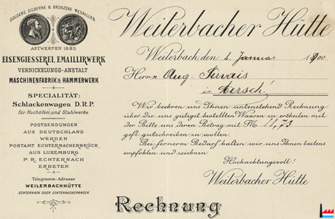 ![]() Weilerbacher Hütte, Weilerbach - Rechnung vom 4.1.1900 an Auguste Servais, Mersch (Collection: Familienarchiv Servais) |