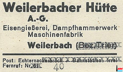 | <=3.8.1935 | ![]() Weilerbacher Hütte A. G. - Eisengieβerei, Dampfhammerwerk, Maschinenfabrik Weilerbach |