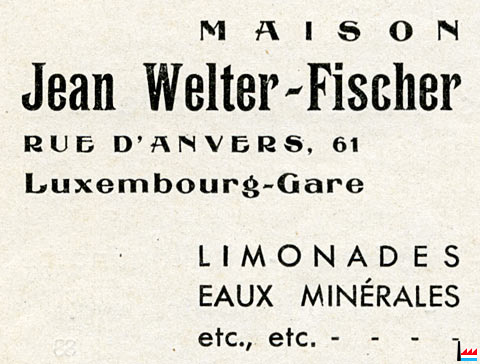 Jean Welter - Fischer Fabrique d'Eaux Minérales et de Limonade Gazeuse 61 rue d'Anvers (rue Feldgen) Luxembourg - Gare Téléphone: 2841 |