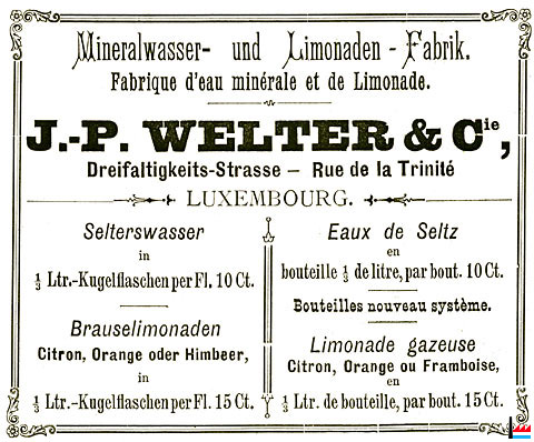 | 1913 | Welter - Scholer J.-P. et Cie, Fabricants d'eaux gazeuses, Esch/Alzette |