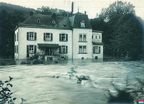 ![]() Das Gebäude der früheren Getreidemühle der Dunamühle - Douna, Dommeldingen - 1921 bei Hochwasser - in " Hundert Jahre Eicher-Hütte" Notizen von Camille Aschman (Collection famille Aschman-Bodson) |