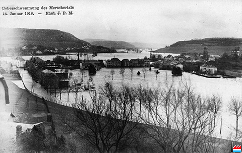 | 16.1.1918 | Hochwasser: Das Hüttenwerk Dommeldingen steht still und die Lieferung des elektrischen Stromes für die Stadt ist unterbrochen. Der Tram fährt nicht. Hochwasser: Die mechanische Holzschuhfabrik des Herrn Terlinden steht ganz unter Wasser. (OMZ: 18.1.1918) |