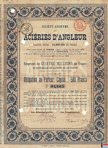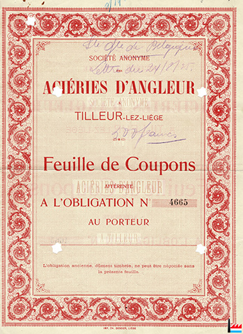 ![]() Obligation au porteur de la Société Anonyme des Aciéries d'Angleur, Tilleur-lez-Liège - 1894 - Feuille de coupons (Collection: industrie.lu) Capital: 500 fr Emprunt de 4.000.000 fr en 8000 obligations de 500 fr |