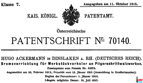 | <=1912 | Hugo Ackermann, Dinslaken/Rhein Ackermann - Pilgerschrittwalzwerk zur Herstellung nahtloser Stahlrohre Laminoir à pas de pèlerin système Ackermann - Tubes sans soudure |