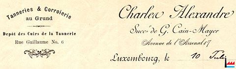 | <=1895 | Charles Alexandre Successeur de G. Cain - Mayer Tannerie & Corroierie au Grund Dépôt des cuirs de la tannerie |