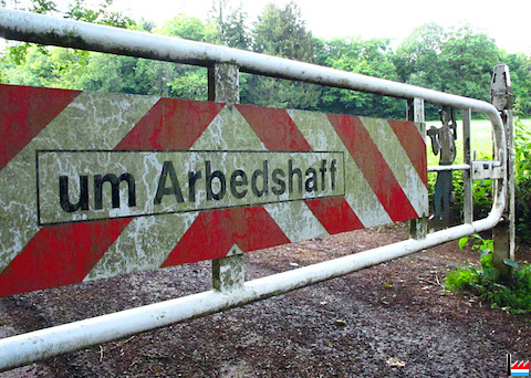 ![]() Jahre lang zierte diese von der Gemeinde Rümelingen angebrachte und zum Ort passende drehbare Wegsperre den Waldeingang in Richtung Rümelinger Heed. (Photo: 2018 Claude Hermes) Leider wurde diese von der luxemburgischen Straßenbauverwaltung (Pont et chaussées) durch eine standardisierte Halbschranke, wie man sie auf allen Radwegen sieht, ersetzt. |