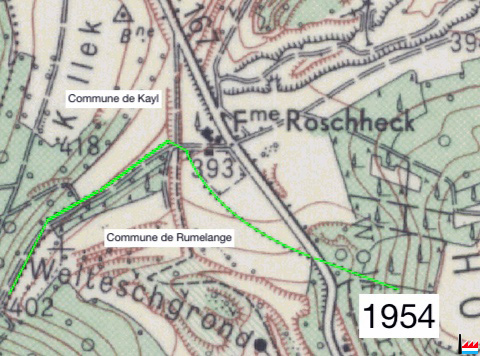 ![]() Ferme Roschheck © Origine Administration du Cadastre et de la Topographie Luxembourg (ACT) - Extrait de la carte topographique à l'échelle 1: 25.000 édition 1954 - Autorisation de publication du 20.10.2010.» |